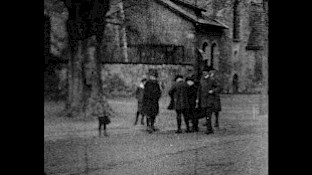 vermutlich ein Sonntagsspaziergang nach der Kirche (Kirche im Hintergrund),