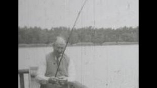 tolle alte Holzhütte, Mann mit Zigarre im Mund (Industrieller?) holt am See eine Angel ein,