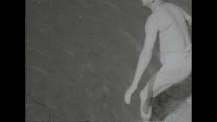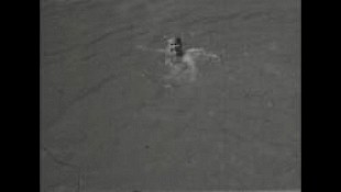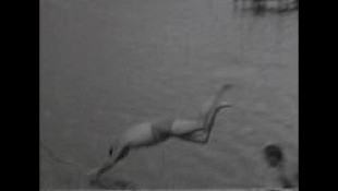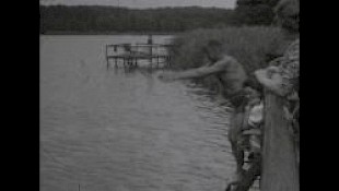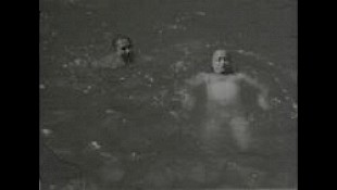 Mann schwimmt freudig im See, zweiter Mann springt hinzu (er hat eine Badehose an, die einer Unterhose gleicht),