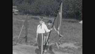 Gang zum Sportplatz (ca. 20 Kinder und Jugendliche), Fahnenappell FDJ Fahne,