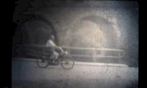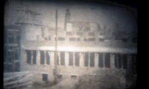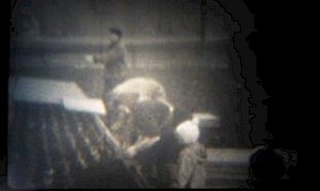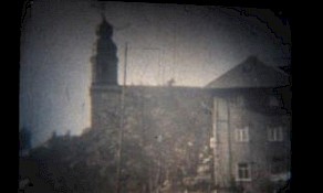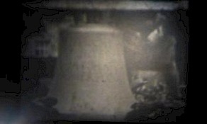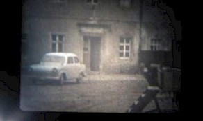 Glocke mit Aufschrift wird auf LKW gebracht, parkender Trabant (Trabi)