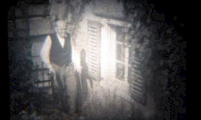 Opa im Garten am Haus, Baustelle eines großen Gebäudes mit dahinterliegender Kirche,