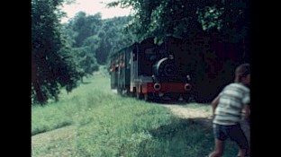 Landgasthof Hirschen, Eisenbahn / Dampflokomotive (ohne Dampf) jedoch auf Straßenrädern! fährt durch Wald,