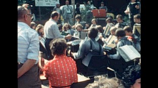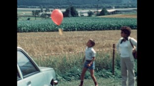 auf einem Feld lassen Kinder Luftballons mit angehängten Zetteln fliegen, Schifferklavierkapelle, Akkordeonorchester gibt Konzert,