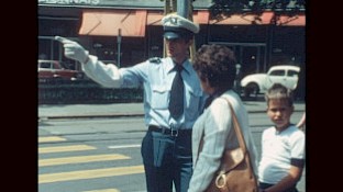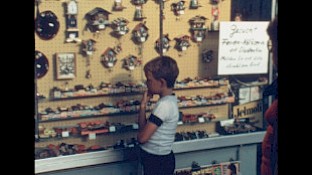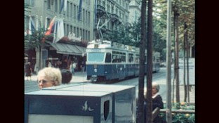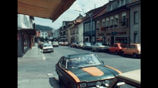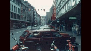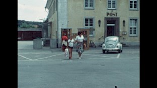 verschiedene Straßenzüge, VW Käfer parkt vor Post, Bahnhof, Bahnsteig mit einfahrendem Zug,