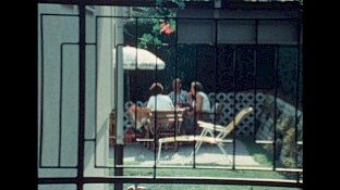 Familie beim Essen auf Terasse eines Einfamilienhauses, Biene auf Rapsblume