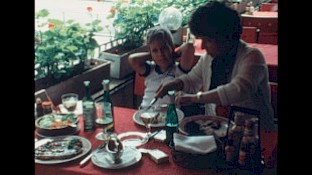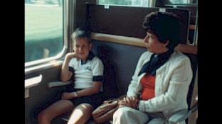 Bahnhof Koblenz, Bahnsteig mit einfahrendem Zug, Fahrt mit Zug nach Zürich,Mutter und Sohn sitzen am Fenster im Zugabteil,