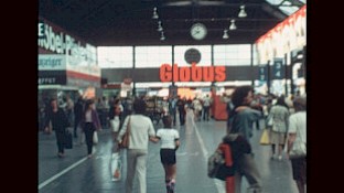 Bahnhof Zürich, Tafel mit Abfahrtszeiten, große Werbung "Globus", Bahnhof von außen,