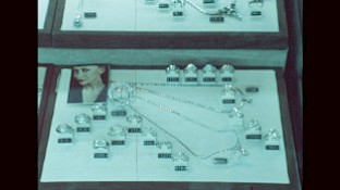blaue Straßenbahn fährt durch Straße, Einkaufsstraßen, Juweliergeschäft, Auslage mit Juwelen, sehr teuerem Schmuck,
