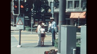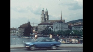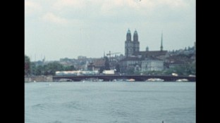 Polizist zeigt Familie den Weg, reformierte Kirche Fraumünster, Ausflugsschiff "Helvetia",