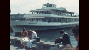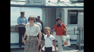 Familie am Heck des fahrenden Schiffes mit wehender Schweizflagge,