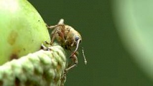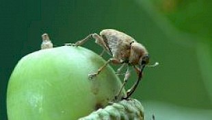 Der etwa 6 mm große Eichelbohrer (Corculio glandum) bohrt eine Eichel an.