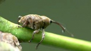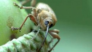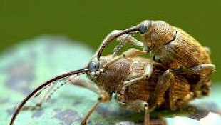 Die Käfer gehören zu den Rüsselkäfern und ernähren sich von der Frucht.